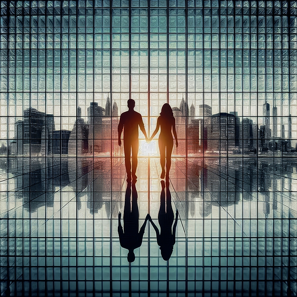 This piece blends the futuristic with the personal โ two figures walking hand in hand toward the light, surrounded by glass and skyline. I began with one of my own photographs and then reimagined it with a mix of digital painting and AI assistance.