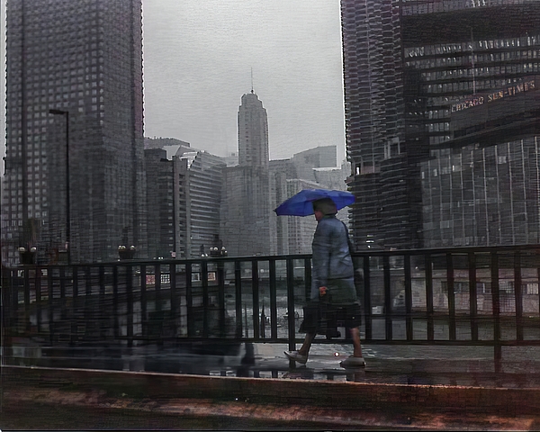 This digital painting, based on a photograph I took in the late 1980s, portrays a solitary figure braving a rainy Chicago day. The moody grays of the city contrast with the vivid blue of the umbrella, evoking both the nostalgia of the era and the timeless solitude of urban walks in the rain. IMG_1989dp