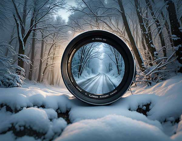 My imagination at work using digital art! A reflected view in my camera lens of a snowy landscape view. IMG_0174