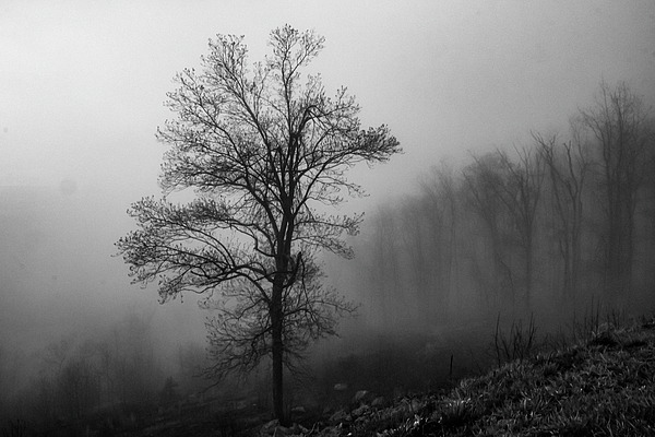 This black and white photograph captures the serene and timeless beauty of a solitary tree enveloped in fog in the Blue Ridge Mountains of Virginia.... more